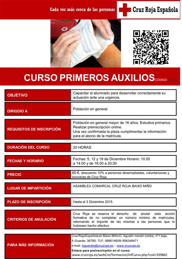 Cruz Roja Española en A Guarda informa de la realización del curso primeros auxilios. Esta formación está dirigida a personas mayores de 16 años, que están interesadas en adquirir conocimientos acerca de Primeros Auxilios.