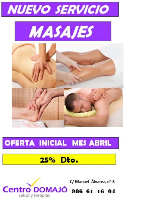 El Centro de Salud y Terapias Domajó de A guarda ofrece desde este mes de Abril un nuevo servicio de masajes con una oferta de lanzamiento de 25% de descuento sólo durante el presente mes.