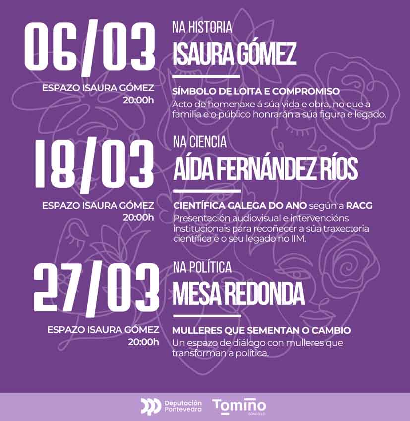 No ámbito científico, o 18 de marzo ás 20.00 horas renderase homenaxe a Aída Fernández Díaz, recoñecida como científica galega do ano pola Real Academia Galega de Ciencias, destacando o papel das mulleres na investigación e no coñecemento. A dimensión política terá o seu espazo o 27 de marzo ás 20.00 horas cunha mesa redonda protagonizada por mulleres referentes neste eido.