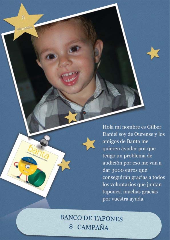 Este vindeiro Sábado día 7 de Febreiro de 2015 terá lugar no local de BANTA(Banco de Tapones do Baixo Miño) en Tomiño, unha nova selección de tapóns na 8ª Campaña, que neste caso axudará a Gilbert Daniel a acadar os fondos precisos para o seu problema de audición.