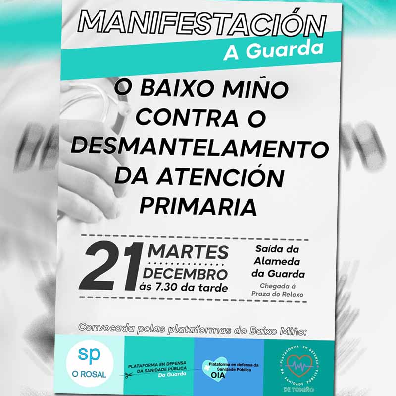 A manifestación, que está convocada polas plataformas en defensa da sanidade pública do Baixo Miño, terá lugar este martes día 21 ás 19:30h desde a Alameda da Guarda. O BNG anima a todo o Baixo Miño a participar da mesa.