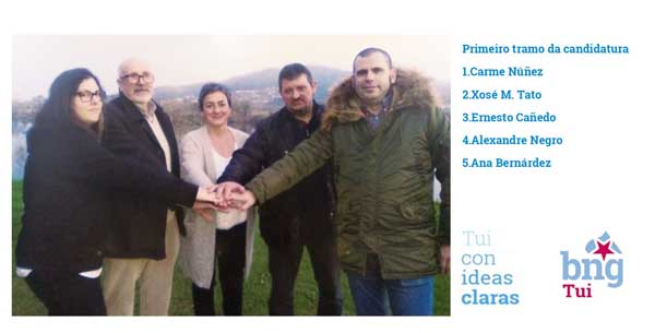 O BNG é a primeira organización política en presentar o primeiro tramo da candidatura ás eleccións municipais de 2019. A lista aprobada en asemblea local aberta , estará encabezada por Carme Núñez (concelleira de patrimonio no governo anterior), actual portavoz municipal da formación nacionalista; reside na parroquia de Pexegueiro, traballa como médica de atención primaria no centro de saúde de Tomiño,e, é portavoz no Baixo Miño da Plataforma Soligariedade Galega co Pobo Saharauí. De número dous irá Xosé Martínez Tato (concelleiro de medioambiente, limpeza,participación cidadá e do medio rural de Tui),veciño das Bornetas, xubilado do sector do metal, presidente da asociación "Anda Tui-Rego da Pedra", de número tres Ernesto Cañedo, veciñ@ de Baldráns, técnico de instalacións de liñas eléctricas,foi delegado sindical do metal na CIG, membro da comunidade de montes de Baldráns,activista en diversas asociacións veciñais, membro da asociación "Amizade galego-cubana Francisco Villamil" ademáis de outras asociacións de solidariedade internacionalistas, colaborador en actividades na defensa do medioambiente e militante do Partido Comunista do Pobo Galego, como número 4 Alexandre Negro, veciño do casco histórico de Tui, técnico superior en comercio internacional, operario de automoción,e, de número 5, Ana Bernárdez, veciña de Pexegueiro,técnica superior en axencias de viaxes e en guías, información e asistencias turísticas responsábel comarcal de Galiza Nova no Baixo Miño e portavoz da Asemblea de Mulleres na Comarca.