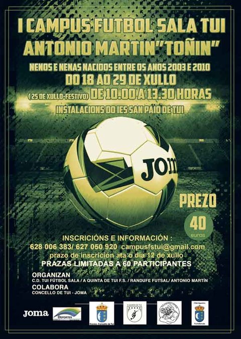 Por isto e co obxectivo de seguir promocionando esta modalidade deportiva entre a poboación tudense, este ano organízase o "I Campus de Fútbol Sala Antonio Martín", que se desenvolverá de luns a venres entre os días 18 e 29 de xullo, de 10.00 a 13.30 horas, nas instalacións deportivas do IES San Paio de Tui.