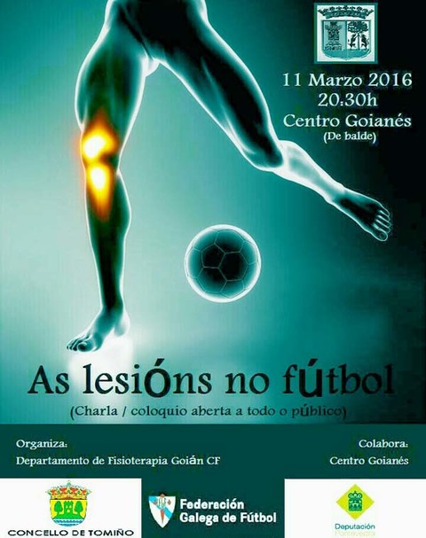 O Goián CF convida a todo o público a  unha novedosa iniciativa que se trata dunha charla/coloquio no "Centro Goianés" o Venres 11 de Marzo as 20:30h, a cal está dirixida a todo o mundo que lle guste a práctica deportiva, e máis concretamente o fútbol, xa que contaremos con fisioterapeuta do clube, para que nos mostre as principais doenzas nos futbolistas, asi como evitalas.