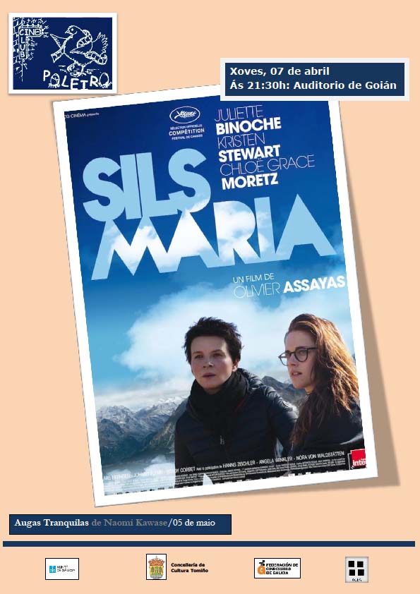 O xoves 7 de abril o cineclub Poleiro proxecta ás 21:30 horas, no auditorio de Goián a película Viaxe a Sils María. Trátase dun drama francés protagonizado por Juliette Binoche e dirixido por Olivier Assayas