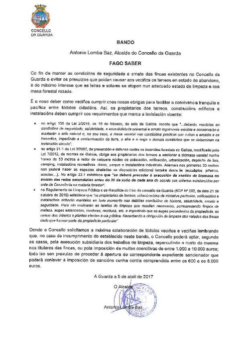 O Concello da Guarda acaba de emitir un bando recordando á cidadanía as obrigas que os propietarios de terreos, fincas e leiras teñen sobre a limpeza e o mantemento das mesmas.