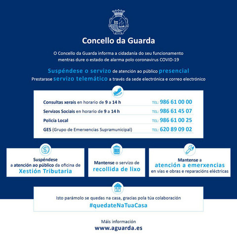 O Concello da Guarda quere destacar que o funcionamento dos servizos de forma telemática e con teléfonos descentralizados nos domicilios dos traballadores é posible grazas a estructura de comunicacións que ten habilitada departamento de Novas Tecnoloxías, agradecendo a colaboración de todo o funcionariado e traballadores municipais para continuar prestando os servizos básicos á cidadanía.