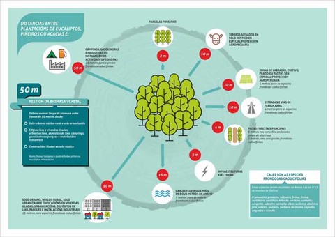 • Os propietarios dos terreos teñen a obriga de xestionar a biomasa vexetal nunha franxa de 50 m arredor de calquera núcleo de poboación, edificacións, urbanizacións, depósitos de lixo, cámpings, gasolineiras e instalacións industriais situados a menos de 400 m do monte.