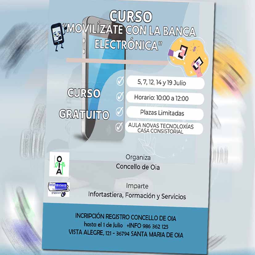 O Concello de Oia organiza o curso “Mobilízate coa banca electrónica”, có obxectivo de ofrecer formación e asesoramento no uso seguro dun tipo de servizos que actualmente teñen moita demanda. A actividade é gratuíta baixo inscrición previa e desenvolverase os martes e xoves do vindeiro mes de xullo.