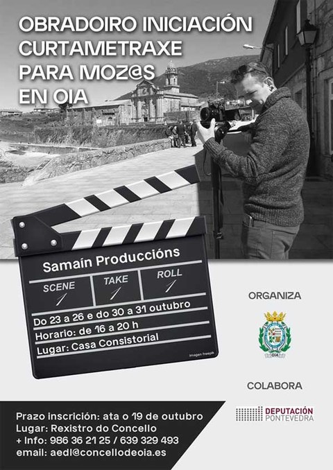 O Concello de Oia, abre o prazo para inscribirse no Obradoiro de iniciación á curtametraxe en galego, que se vai celebrar na semana do 23 ao 26 de outubro e o 30 e 31 do mesmo mes, de 16 a 20 h, na Casa Consistorial. Está previsto que se proceda a proxección da curtametraxe na Semana Cultural de Pedornes que se celebrará a principios de novembro.