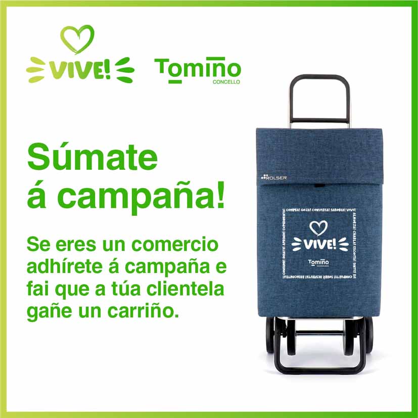 O Concello de Tomiño continúa dando pulo ao comercio local e fomentando o consumo de proximidade. Ao abeiro da campaña ‘Vive!’, acaba de poñer en marcha ‘Mercar no comercio de Tomiño ten premio’, un sorteo a través do que se repartirán 190 carriño para a compra Rolser entre veciños e veciñas que aposten por mercar no seu municipio.