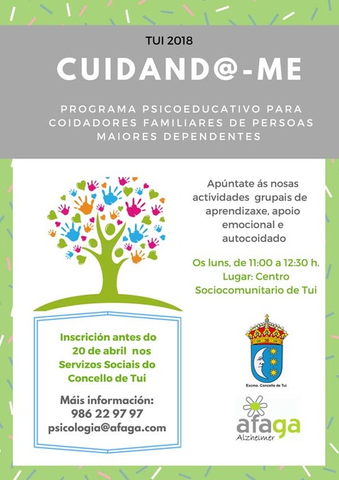 O Concello de Tui, a través dos Servizos Sociais Comunitarios, e AFAGA, a Asociación de Familiares de Alzheimer e outras demencias de Galicia, organizan o programa psicoeducativo para coidadores familiares de persoas dependentes ou con discapacidade Cuidand@-me. Desenvolverase entre os meses de maio e novembro cun total de 24 sesións os luns de 11 a 12.30h no Centro Sociocomunitario de Tui. Ofértanse quince prazas, e unha vez cubertas elaborarase unha lista de agarda.