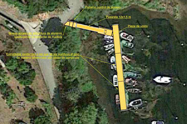 Os traballos previstos contemplan a substitución do chan de madeira existente no pantalán por un piso de composite, a substitución da pasarela existente por unha nova máis ancha, e o cambio da plataforma  de acceso actualmente en terra por unha estrutura de aluminio con piso de composite. Ademais, tamén levarase a cabo o recrecido dunha das patas do tramo fixo, a substitución do portalón existente por un situado no tramo fixo de acceso, e a montaxe dunha peza de conexión co pantalán, en forma de T baixo a pasarela e o atraque.