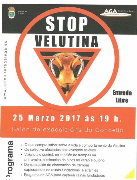 A  Asociación Galega de Apicultura (AGA) organiza a xornada Stop Vespa Velutina, que se celebrará o vindeiro 25 de marzo ás 19.00h no salón de exposicións do Concello do Rosal.