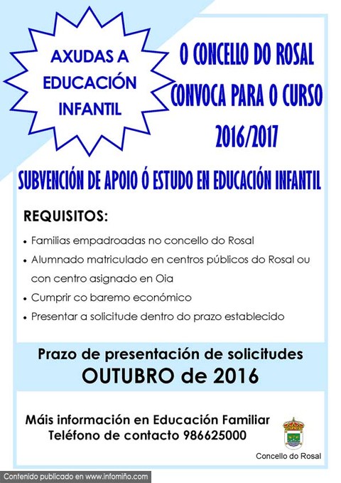 O CONCELLO DO ROSAL CONVOCA AXUDAS A EDUCACIÓN INFANTIL PARA O CURSO 2016/2017