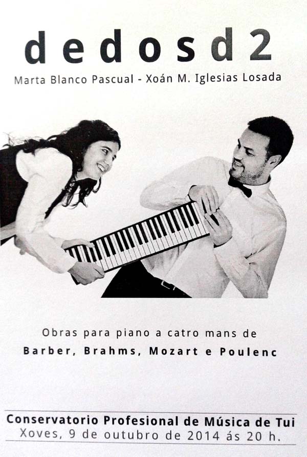 O concerto correrá a cargo do dúo de piano dedosd2 formado por Marta Blanco Pascual e Xoán M. Iglesias Losada. O grupo constituído en 2011 cunha xira de concertos por Galicia os dous ao piano. Ao ano seguinte ampliaron a súa formación cos profesores Josep Colim e Imhre Rohman. O concerto de Tui é unha das actuacións que figuran no programa que teñen para este curso onde tamén achegarán a súa música a Monforte e León.