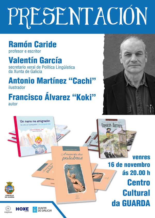 Neste acto de presentación, que terá lugar ás 20:00h no Salón de actos do Centro Cultural, contarase coas intervencións de Ramón Caride, profesor e escritor; Valentín García, Secretario Xeral de Política Lingüística da Xunta de Galicia, Antonio Martínez «Cachi», Ilustrador, Elena Baz, Concelleira de Cultura do Concello da Guarda e o autor, Francisco Álvarez «Koki».