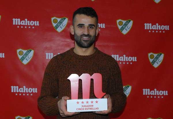O futbolista tomiñés Diego Silva vén de recibir o premio ao Xogador Cinco Estrelas da primeira volta, un certame impulsado por Mahou a través do que os afeccionados elixiron ao xogador do Coruxo FC como mellor deportista do seu equipo durante a primeira metade da temporada.
