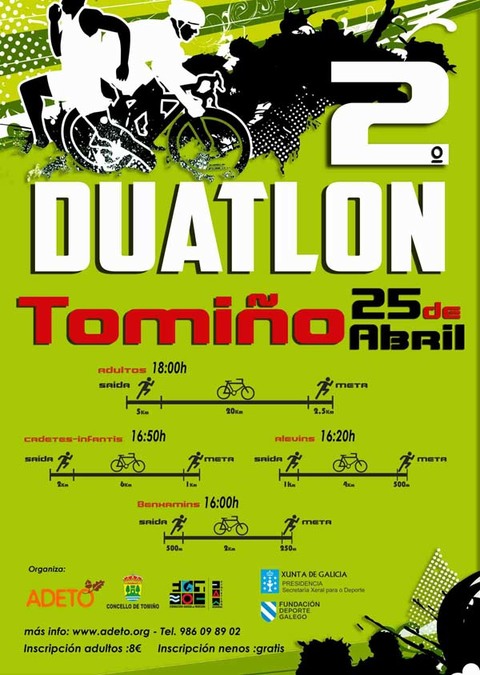 A Asociación de Comerciantes de Tomiño (Adeto) organiza coa colaboración do Concello de Tomiño, e a Federación Galega de Triatlón (Fegatri), o II Duatlón Popular de Tomiño, que terá lugar o vindeiro sábado, 25 de abril, a partir das catro da tarde.