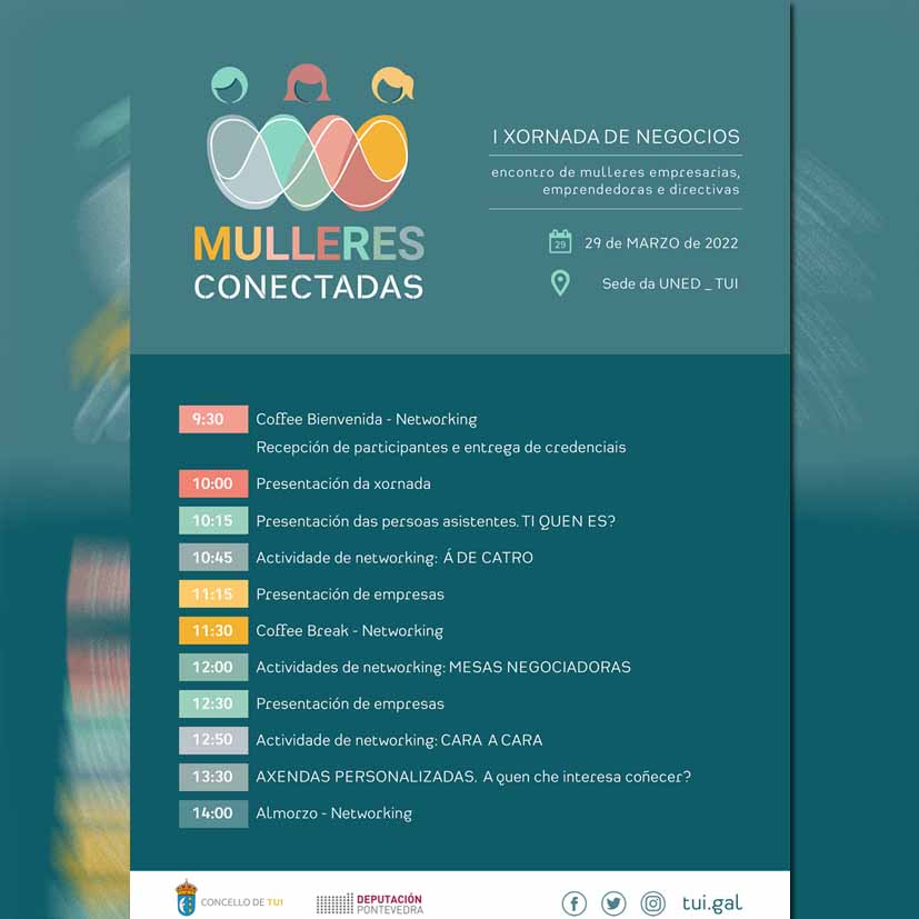 “Mulleres Conectadas” é o título do primeira xornada de negocios que se vai celebrar o martes, 29 de marzo, na Aula da UNED de Tui. Está organizado polo Concello de Tui, a través da concellería de igualdade, dentro programación do mes de marzo.