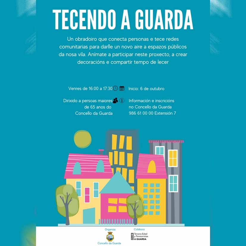 O vindeiro 6 de outubro dará comezo o obradoiro Tecendo A Guarda, unha actividade orientada para que as persoas participantes dediquen parte do seu tempo de lecer a compartir espazos e experiencias á vez que elaboran distintas pezas creativas que serán colocadas en rúas e prazas do Concello, aumentado así o seu sentido de pertenza á comunidade na que viven.