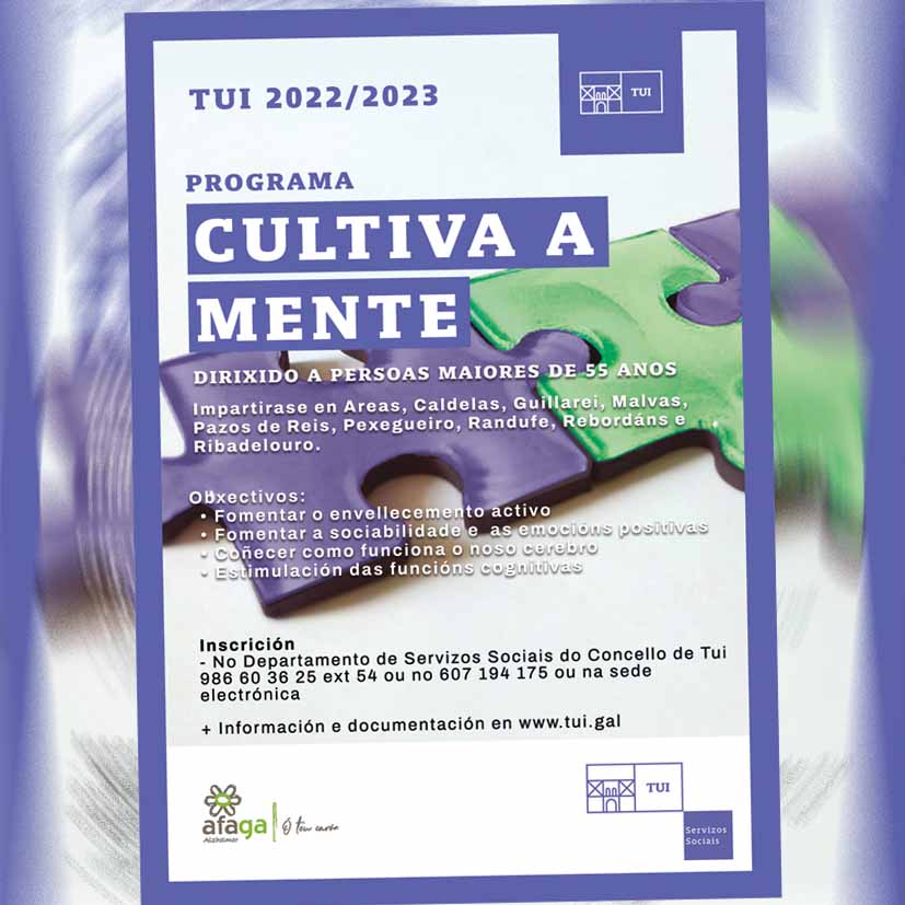 Pexegueiro contará tamén co programa Cultiva a Mente, que este novo curso chegará a nove parroquias tudenses.  As persoas interesadas neste novo grupo de actividade poden realizar xa a súa inscrición descargando da web municipal a ficha de solicitude e presentándoa por sede electrónica en https://concellotui.sedelectronica.gal/ ou directamente nos Servizos Sociais na casa do concello. Pódese ampliar esta información no 986 60 36 25 ext. 25 ou no 607 194 175.