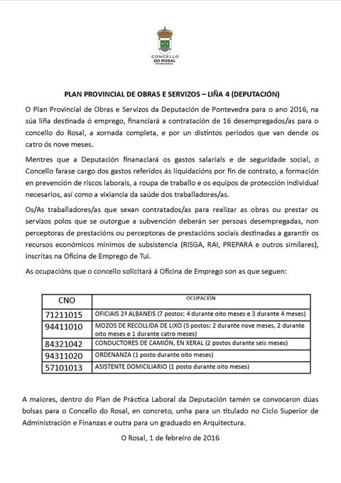 O Plan Provincial de Obras e Servizos da Deputación de Pontevedra para o ano 2016, na súa liña destinada ó emprego, financiará a contratación de 16 desempregados/as para o concello do Rosal, a xornada completa, e por un distintos períodos que van dende os catro ós nove meses.
