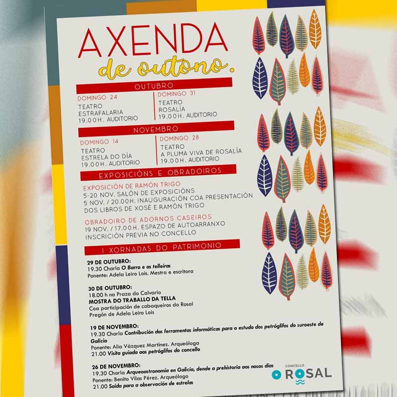 O que queda de outubro e o mes de novembro veñen cargados de cultura no Rosal. O Concello presentou a súa axenda de outono con máis de dez propostas para todos os públicos. A alcaldesa, Ánxela Fernández, mostrouse “moi contenta” de presentar unha axenda “que recoñece o noso patrimonio e o traballo histórico dos cabaqueiros do Rosal”, ademais de “dinamizar de forma segura a cultura do noso pobo”.
