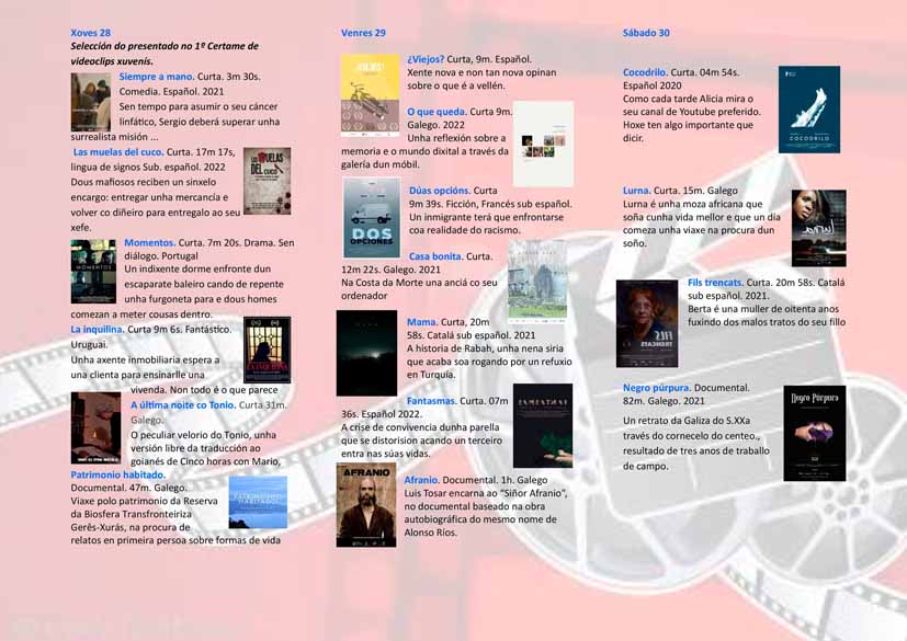 O venres 29, o público asistente poderá gozar das curtas "¿Viejos?", "O que queda", "Dúas opcións", "Casa bonita", "Mama", "Fantasmas", e do documental galego "Afranio", na que o actor Luis Tosar encarna ao siñor Afranio nunha peza baseada na obra autobiográfica do mesmo nome de Alonso Ríos.