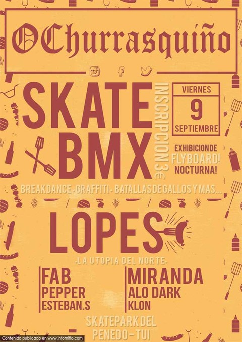 O venres 9 de setembro o Skatepark do Penedo en Tui acolle o festival de skateboard e rap tudense "O Churrasquiño", un evento multidisciplinar no que terán cabida o deporte, a música e a cultura.