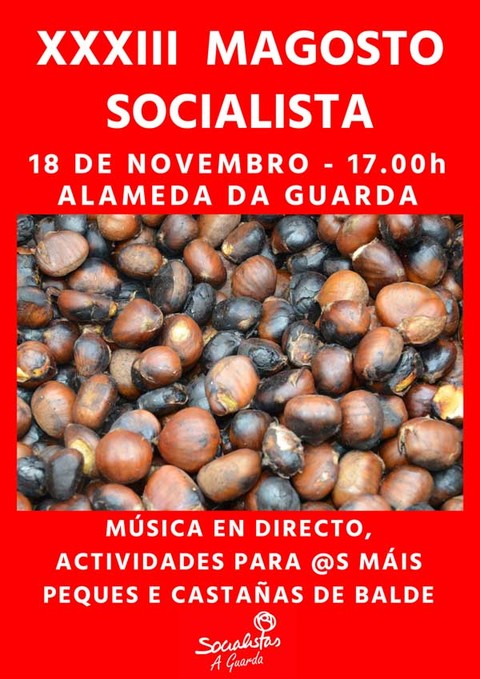 Este domingo 18, como cada novembro dende o ano 1985, terá lugar o tradicional magosto que celebra o PSdeG - PSOE A Guarda na Alameda da vila. Dende ás 17.00h baixo a carpa, contaremos con actividades para @s máis cativ@s e música tradicional en directo. Convidámosvos a que nos acompañedes a degustar as castañas e compartir a tarde connosco con boa música e compañia.