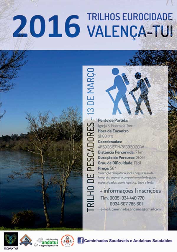 Este domingo, 13 de marzo, comeza o Circuíto de Andainas Saudables da Eurocidade, organizado pola Eurocidade Valença-Tui, co primeiro dos percorridos programados para este ano 2016. Será co Trilho dos Pescadores que sairá ás 10 hora española dende a Igrexa de San Pedro da Torre. Os participantes terán que percorrer unha distancia de 7 quilómetros, de dificultade baixa, cunha duración aproximada de dúas horas e media.