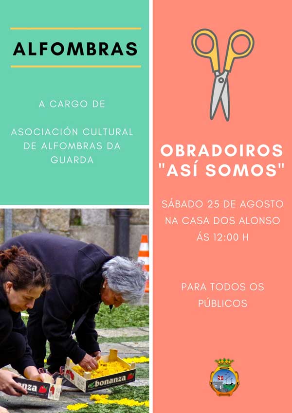 A Casa dos Alonsos da Guarda acolle este sábado día 25 de agosto ás 12:00h do mediodía un obradoiro/demostración das alfombras florais, que cada ano enchen de cor as rúas guardesas polo Corpus Christi. Unha actividade complementaria que se inclúe dentro da Exposición Así Somos, que se atopa neste espazo dende o pasado 20 de xullo.