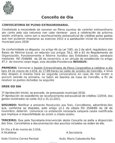 OIA LEVA A PLENO ESTE LUNS 14 DE MARZO A APROBACIÓN INICIAL DOS PRESUPOSTOS DESTE ANO