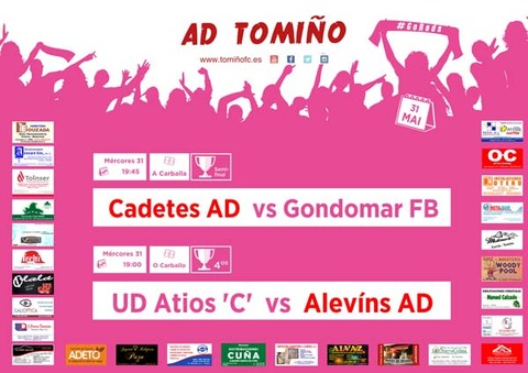 Tanto os Cadetes como os Alevíns da AD Tomiño buscarán emular aos Prebenxamíns vermellos que xa preparan a final de copa que disputarán o vindeiro sábado. A AD Tomiño anima a afección a apoiar aos seus equipos nestes encontros decisivos e especialmente a achegarse a A Carballa mañá mércores para presenciar a entrega do trofeo ligueiro e apoiar ao equipo na súa procura da final.