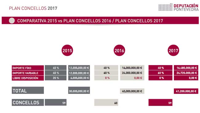 Por elo establécese un novo reparto da cantidade total dos 41.200.000 millóns de euros con que contará en 2017. Os concellos de menos de dez mil habitantes disporán de 18,2 millóns de euros. Os comprendidos entre os dez mil e vinte mil habitantes disporán de  14,1 millóns e os de máis de vinte mil disporán de 8,9 millóns de euros.