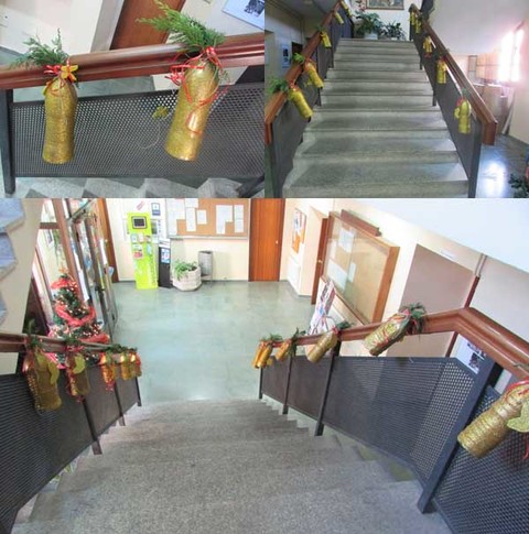 Os participantes do primeiro obradoiro infantil -Decora o teu Nadal- adornan as escaleiras do concello da Guarda