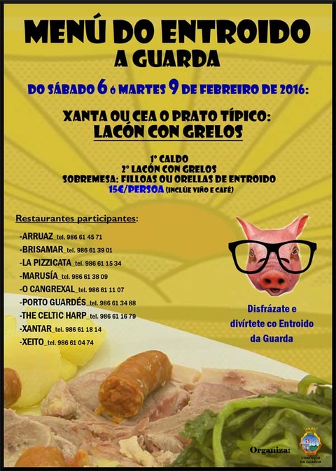 Dende o próximo sábado día 6 de febreiro e ata o martes día 9, ambos inclusive, os restaurantes Arruaz, Brisamar, La Pizzicata, Marusía, O Cangrexal, Porto Guardés, The Celtic Harp, Xantar e Xeito, propoñen un menú de entroido composto por un primeiro prato de caldo, un segundo de lacón con grelos e unha sobremesa na que se escollerá entre filloas ou orellas.
