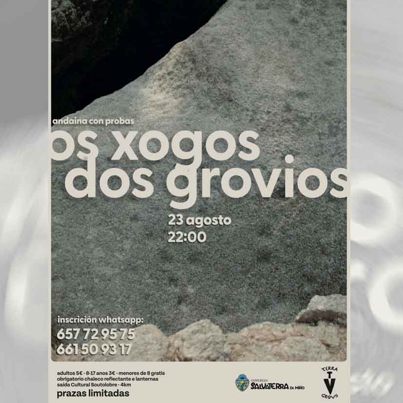 La Asociación Terra Grovii invita a participar en una experiencia única este verano: Os Xogos dos Grovios, una andaina nocturna de 4 kilómetros con juegos y pruebas de habilidad que se celebrará en Salvaterra de Miño el sábado 23 de agosto a las 22:00 horas, con salida desde la Cultural de Soutolobre.