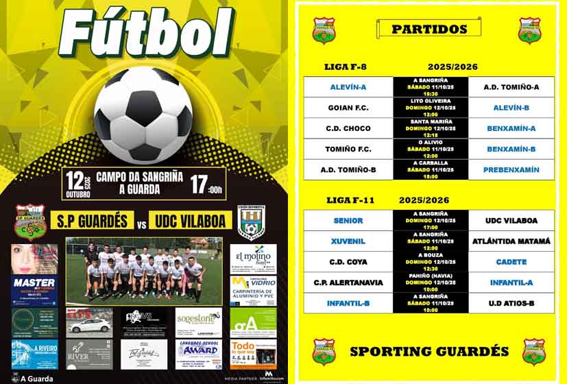 El Sporting Guardés afronta este fin de semana con la ilusión de seguir creciendo tanto en resultados como en afición. Desde el club se invita a la vecindad de A Guarda y comarca a acercarse al Campo da Sangriña para apoyar al equipo senior y disfrutar del fútbol base local.
