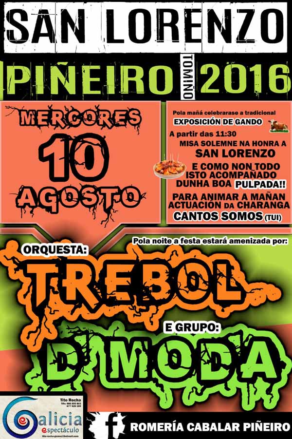 El día 10 de agosto en Piñeiro (Tomiño) se celebrará la fiesta en honor a San Lorenzo. Por la mañana se contará con la tradicional exposición de ganado, donde los vecinos de la zona muestran sus ejemplares, acompañado de una pulpada y de la charanga "Cantos somos".