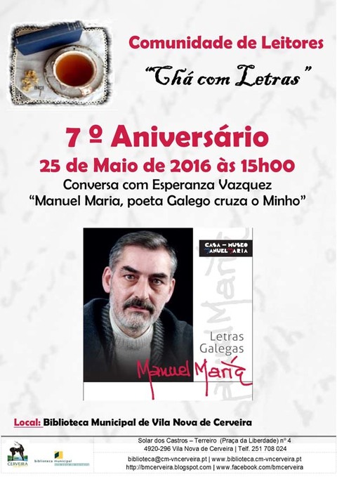 A Comunidade de Leitores de Vila Nova de Cerveira - ‘Chá com Letras' assinala, esta quarta-feira, mais um aniversário com uma sessão especial dedicada ao poeta Manuel Maria, homenageado no Dia das Letras Galegas 2016. A Biblioteca Municipal convida a população a participar nesta atividade que conta com a presença de Esperanza Vázquez.