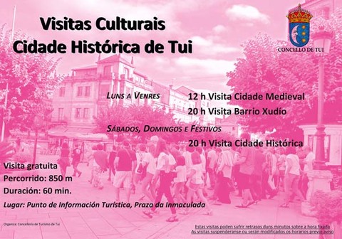 O pasado martes día 25 de xullo, comezaron as visitas culturais á cidade histórica de Tui. Celebraranse de luns a venres ás 12h á cidade medieval, e ás 20h ao barrio xudeu. Mentres os sábados, domingos e festivos terán lugar ás 20h cun percorrido pola cidade histórica.
