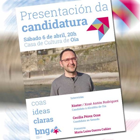 Xoves 4 de abril de 2019. Este sábado, ás 20 horas, na Casa da Cultura de Oia, o BNG dá inicio á carreira eleitoral coa intención de acadar unha ampla representación no Concello se o pobo de Oia lle outorga a súa confianza nas eleicións do 26 de maio.