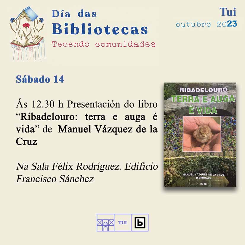 El próximo sábado 14 de octubre, a las 12:30 horas, se llevará a cabo la presentación del más reciente libro del tudense Manuel Vázquez de la Cruz, titulado "Ribadelouro; terra e auga é vida". Este libro, recién editado, recoge las numerosas vivencias y experiencias acumuladas por el autor en torno a su parroquia de Ribadelouro. El evento se llevará a cabo en la Sala Félix Rodríguez González del Edificio "Francisco Sánchez".