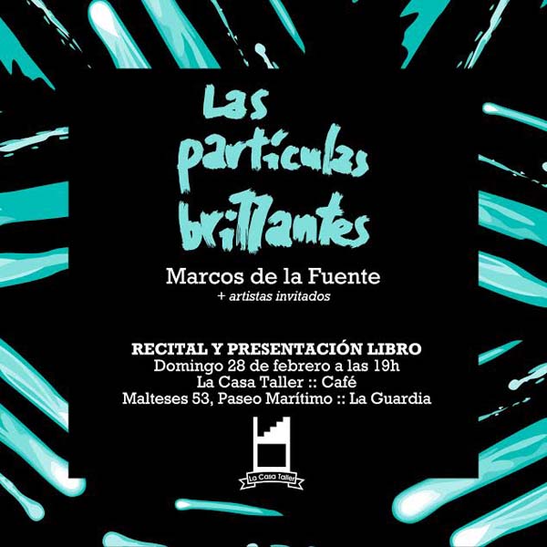 Para acabar la programación de este mes en La Casa Taller de A Guarda, presentamos el Domingo poético. Nuestro primer recital de poesía con Marcos de la Fuente, desde Vigo y su libro "Las partículas brillantes". Además también estará con nosotros Macky Chuca, desde Portugal con su libro "Saliva". Será a las 7 de la tarde, con entrada libre, acercaos y compartid! Actividad gratuita. www.lacasataller.net