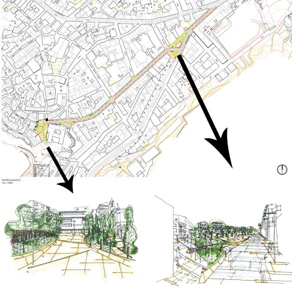 A praza consolidarase arredor do monumento existente con dúas áreas de descanso diferenciadas: unha delas en forma lonxitudinal sobre unha das dúas fachadas acompañada de árbores e zonas de lecer, e a outra área disposta arredor dun dos elementos de formigón, con bancos e zonas verdes.