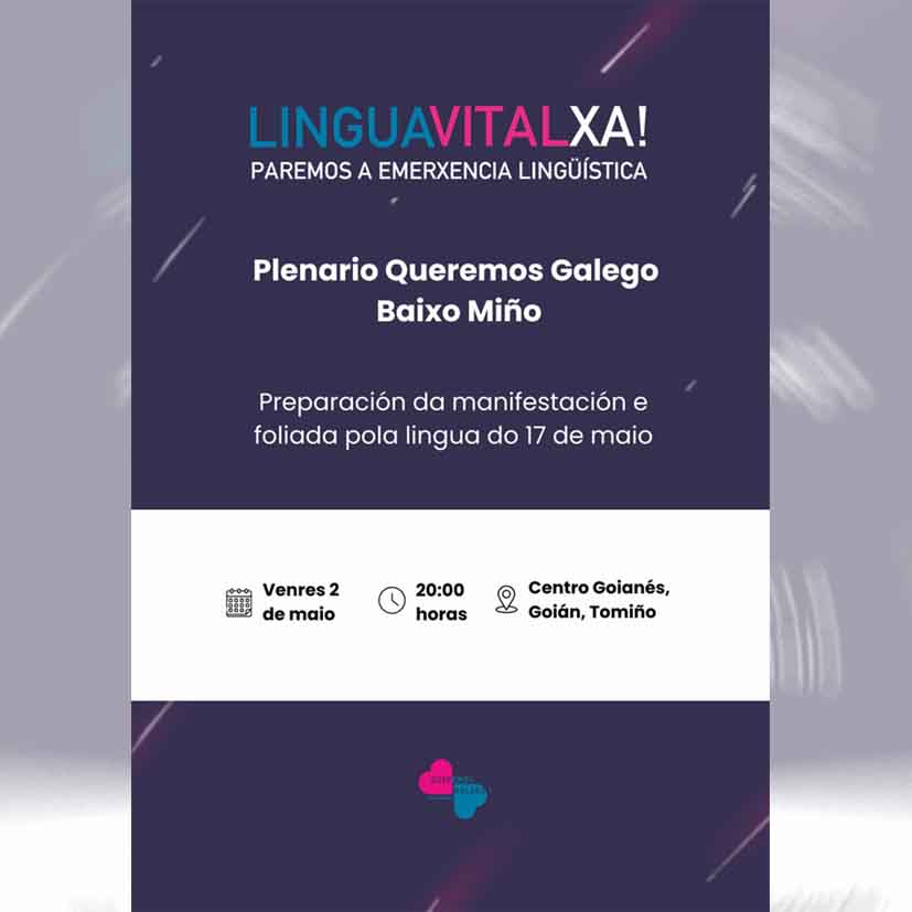 El Centro Goianés será escenario el próximo 2 de mayo, a partir de las 20:00 horas, del plenario comarcal del Baixo Miño convocado por la plataforma Queremos Galego, en defensa de la lengua gallega. El encuentro tiene como objetivo ultimar la organización de la gran manifestación nacional y la foliada que se celebrarán el 17 de mayo en Santiago de Compostela, coincidiendo con el Día das Letras Galegas.