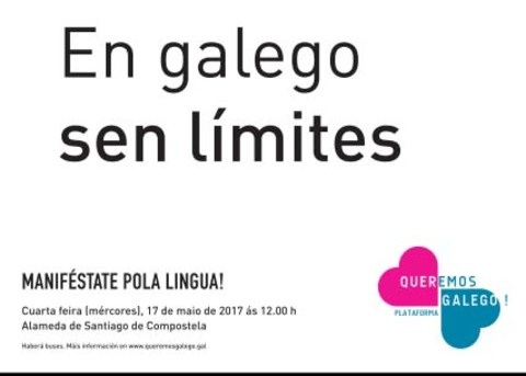 A plataforma cidadá Queremos Galego, composta por máis de 500 colectivos sociais de todo tipo, anuncia a convocatoria dunha multitudinaria manifestación para o 17 de maio baixo o lema "en galego sen límites". A manifestación percorrerá as rúas de Santiago de Compostela saíndo ás 12h da Alameda.
