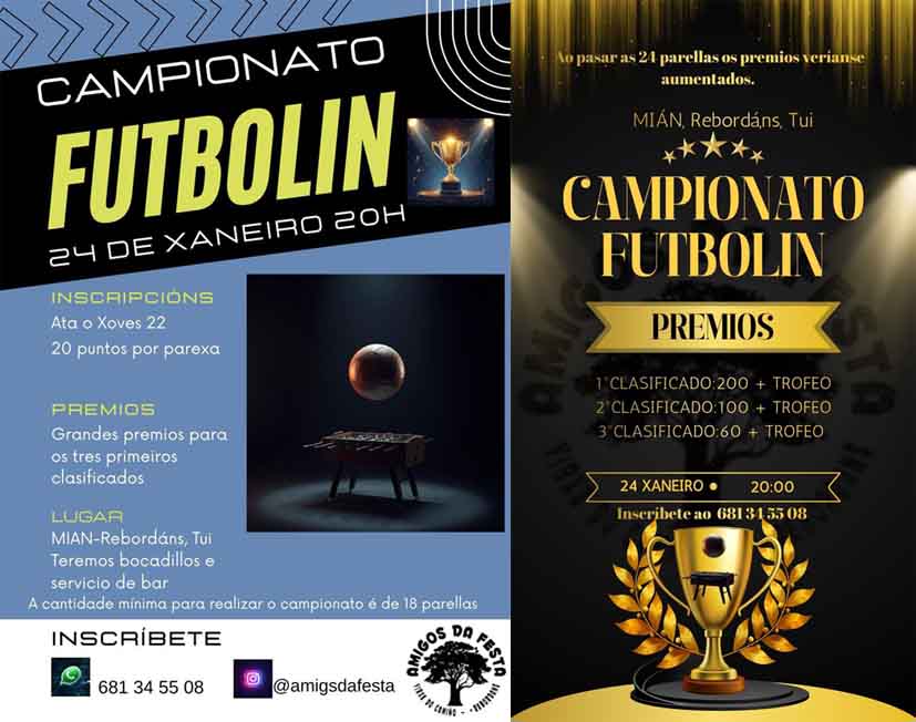 La parroquia de Rebordáns, en el municipio de Tui, se prepara para vivir una noche de competición y ambiente festivo con la celebración de un Campeonato de Futbolín organizado por la Comisión de Festas de Rebordáns. La cita tendrá lugar este sábado 24 de enero a partir de las 20.00 horas en Mian, convirtiéndose en una propuesta de ocio pensada para todos los públicos.